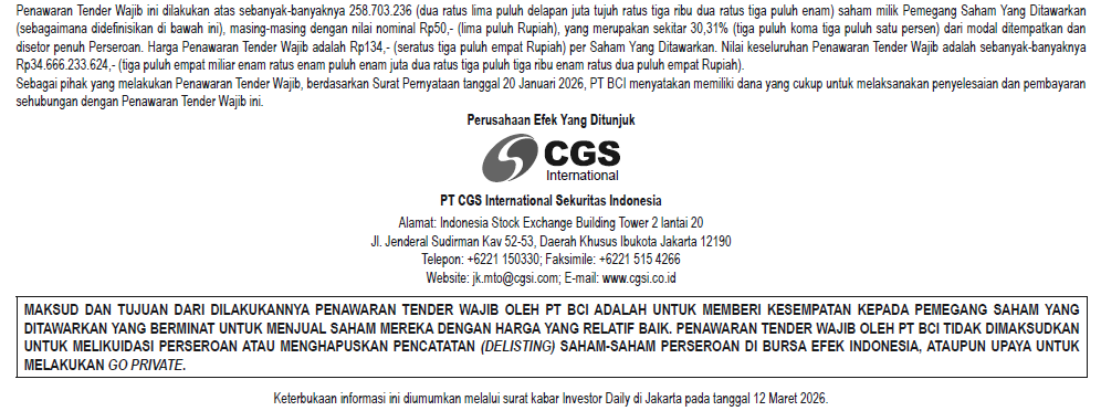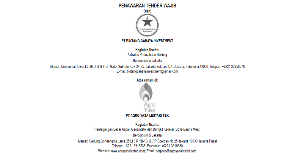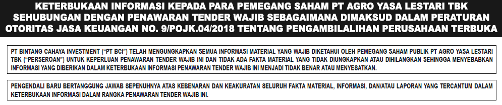 Tender Offer – PT Agro Yasa Lestari, Tbk (AYLS)